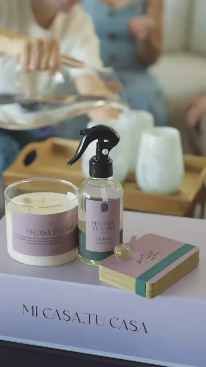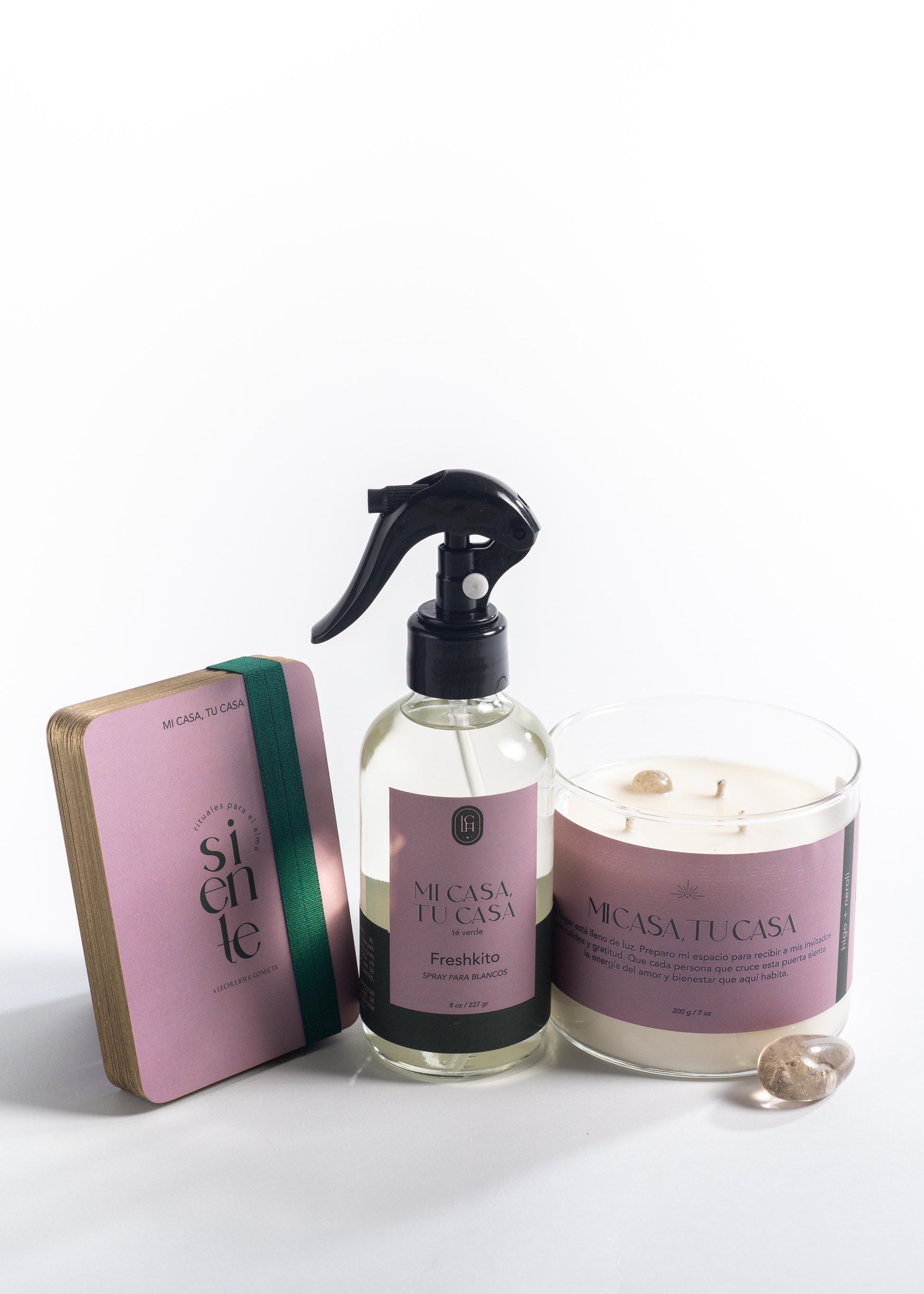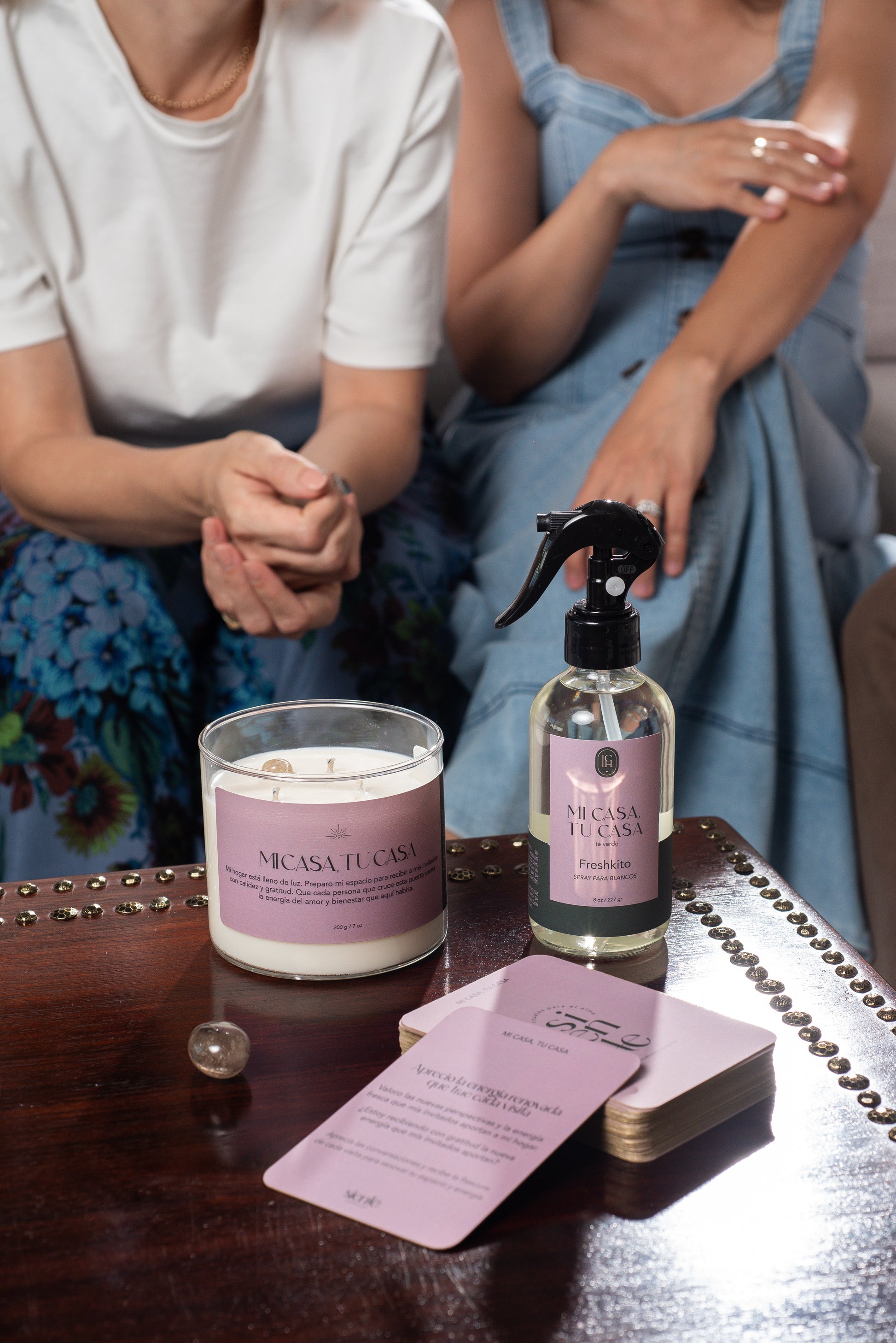 1. Prepara el espacio: Encuentra un lugar tranquilo y cómodo. Toma tres respiraciones profundas para conectar con tu interior. Coloca la vela, el spray y el cuarzo frente a ti.