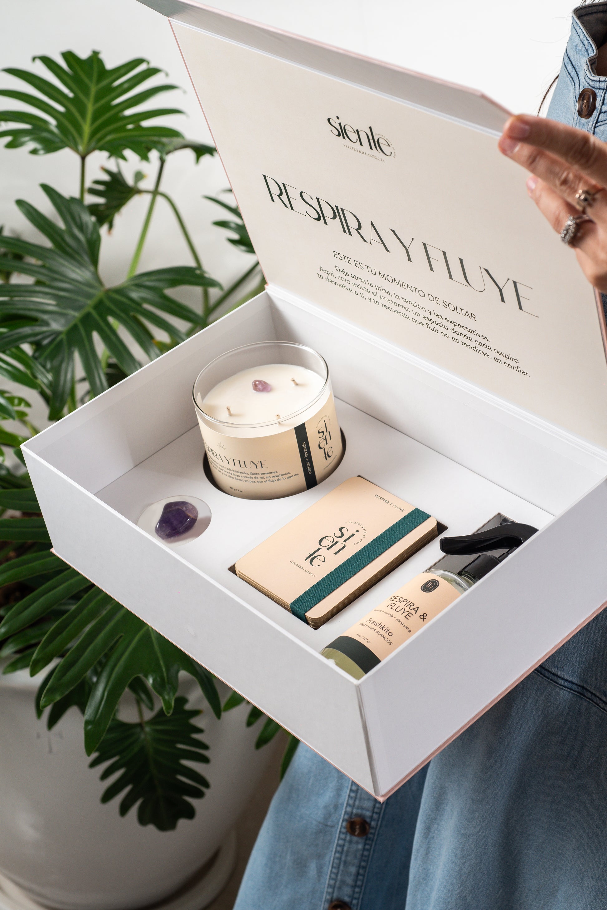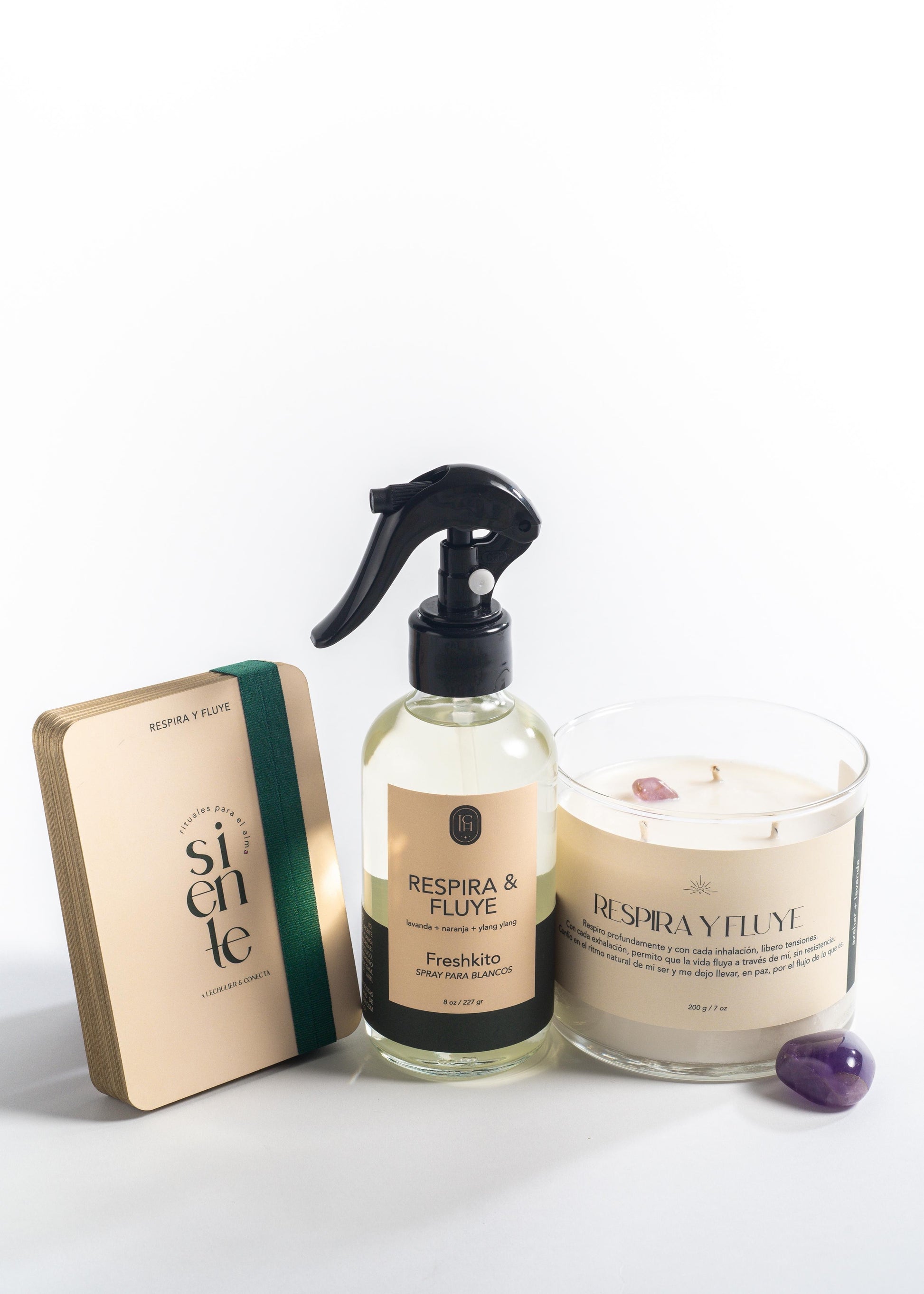 1. Prepara el espacio: Encuentra un lugar tranquilo y cómodo. Toma tres respiraciones profundas para conectar con tu interior. Coloca la vela, el spray y el cuarzo frente a ti.